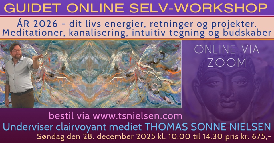 ¤ Guidede meditation: Dit livs energier og dine projekter i 2026 – både overordnet og zoomet ind på udvalgte konkrete område. Selvsyn og fremsyn.
