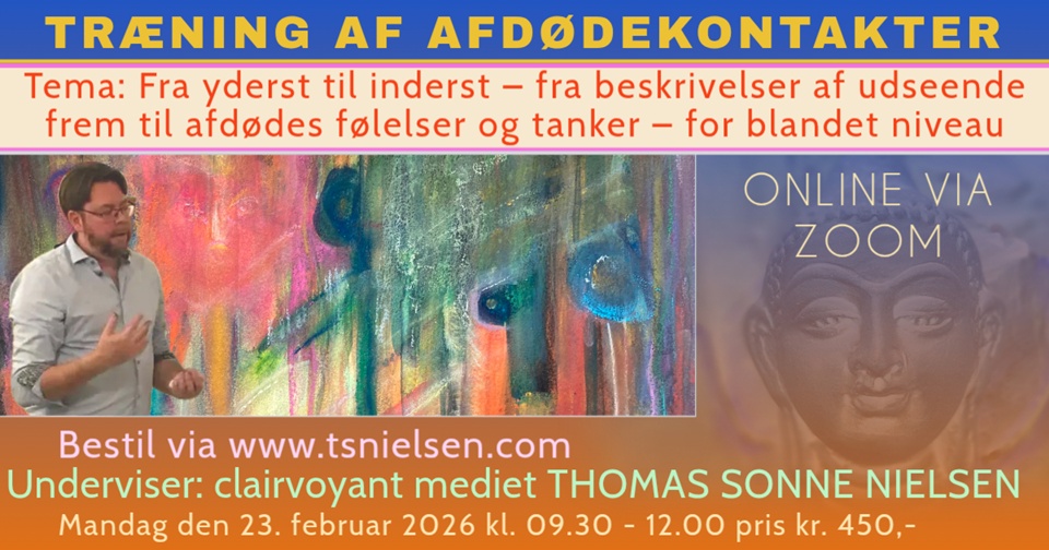 Derefter træner I parvis eller i små grupper af 3, så I kan lave flere afdødekontakter hver især og få hinandens feedback. Jeg kigger med i de forskellige små zoom-rum og giver min personlige feedback og støtte ud fra, hvad jeg oplever, at jeg kan være din udvikling behjælpelig med.